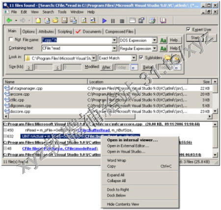 碟的大量文件中快速的搜索出包含指定文本或者數據的所有文件,支援直接對ZIP壓縮包,DOC文